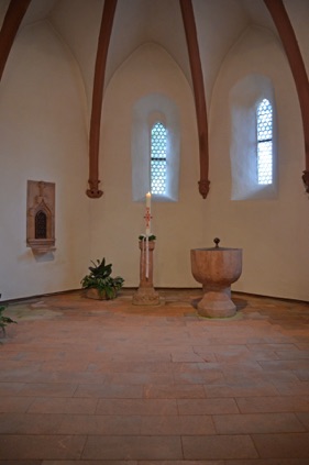 • Ein romanischer Taufstein von halbkugeliger Form, der oben mit einem zwölfseitigem Rand abschloss; dazu ein Zinnbecken aus dem Jahre 1659 (noch vorhanden).